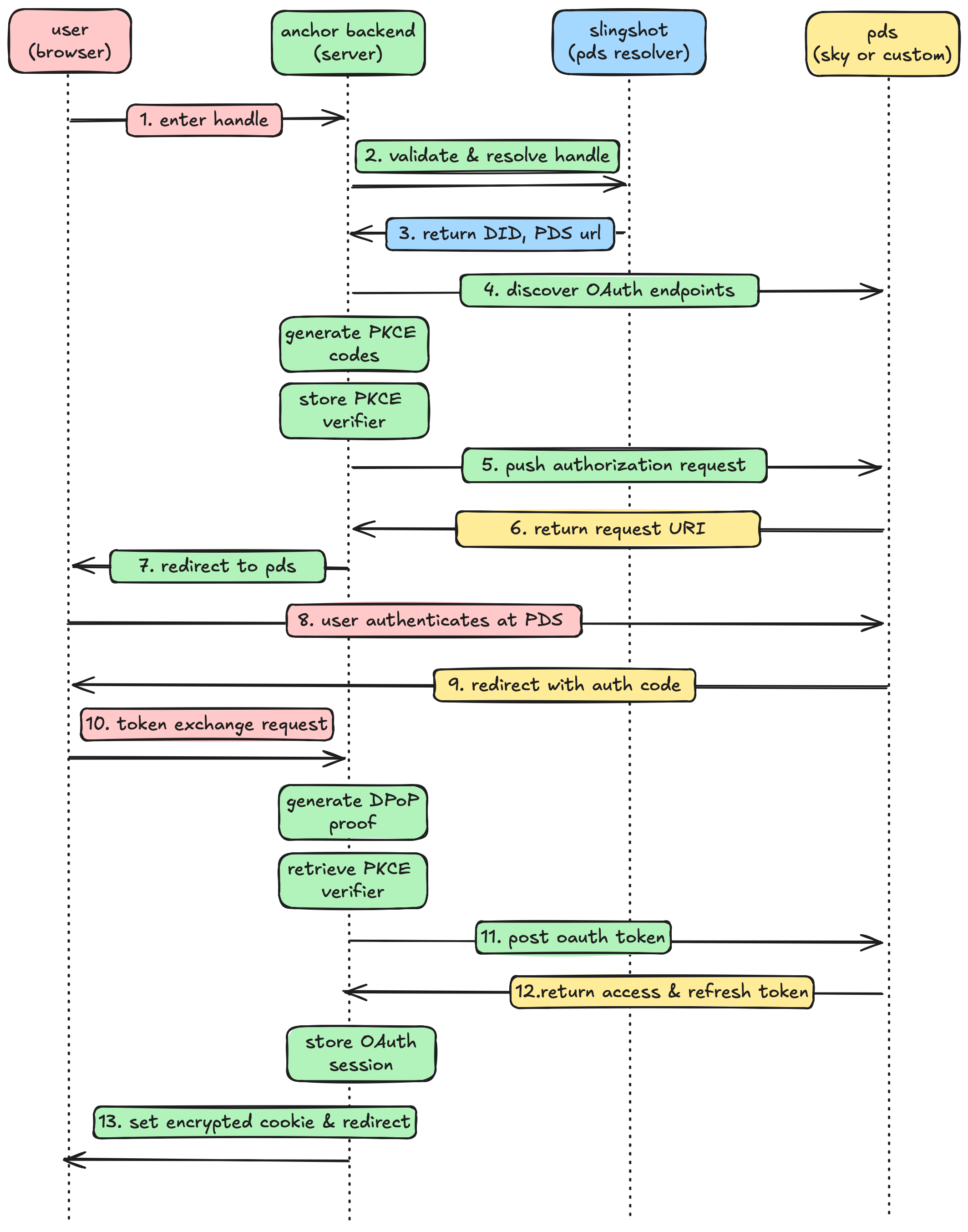 Before we dive into the code, let's visualize the complete OAuth flow. This diagram shows all steps from when a user enters their handle to when they're fully authenticated with an encrypted session cookie.